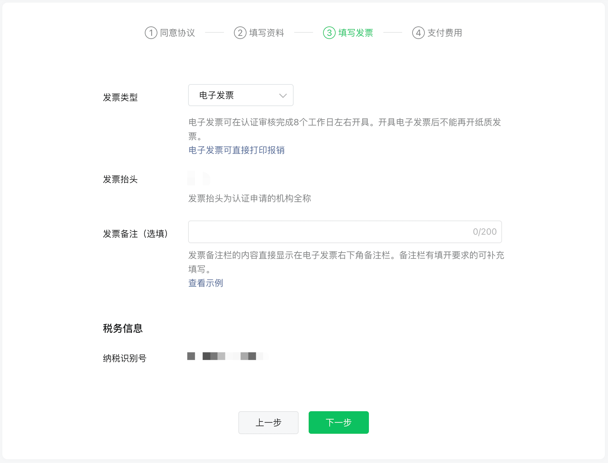 输入发票基本信息,如发票类型、发票抬头、税号、备注等信息