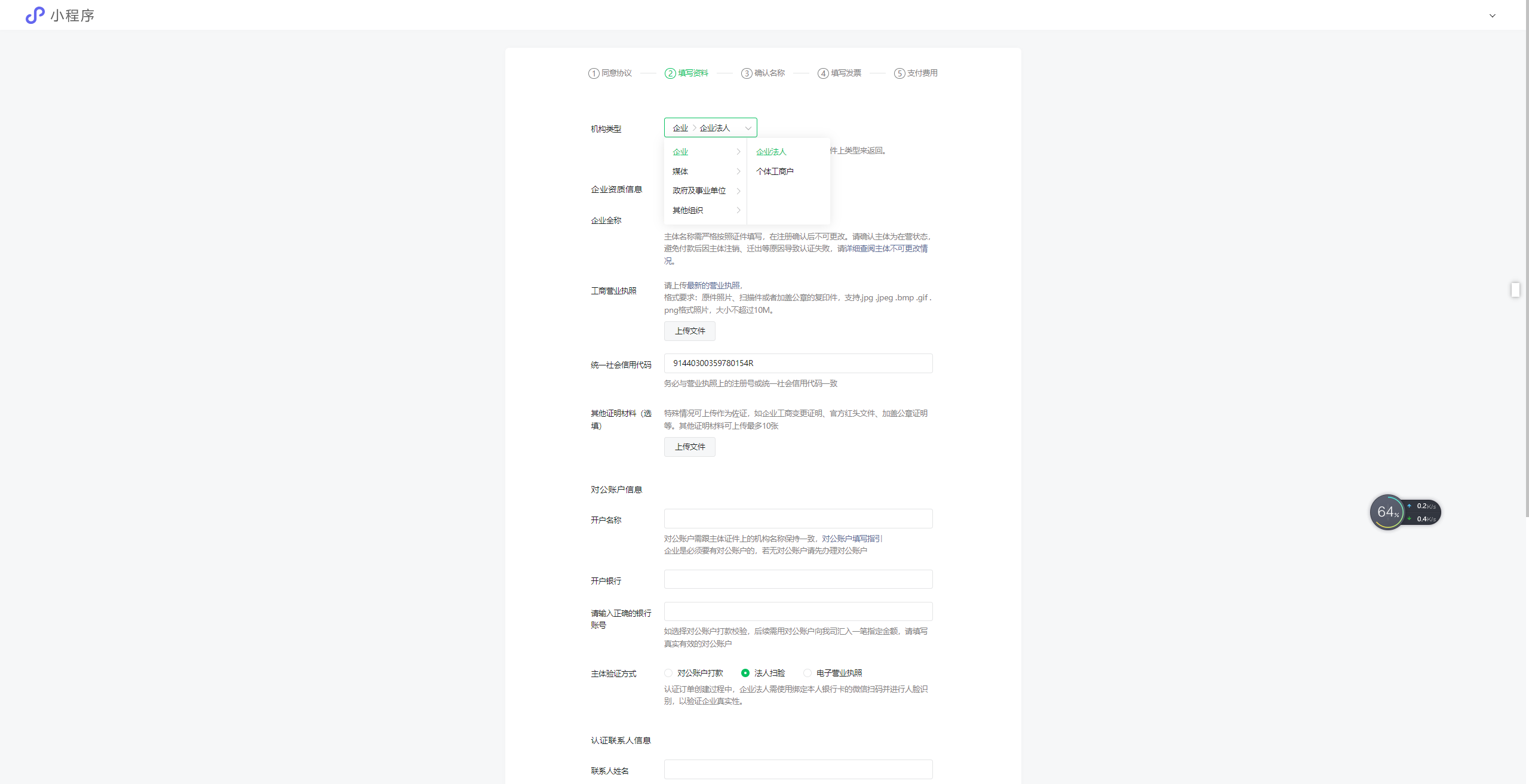 选择认证主体类型,根据提示,提交相应的认证材料(营业执照、对公账户、法人信息)可自主选择主体验证方式(对公账户打款、法人扫脸、电子营业执照验证)
