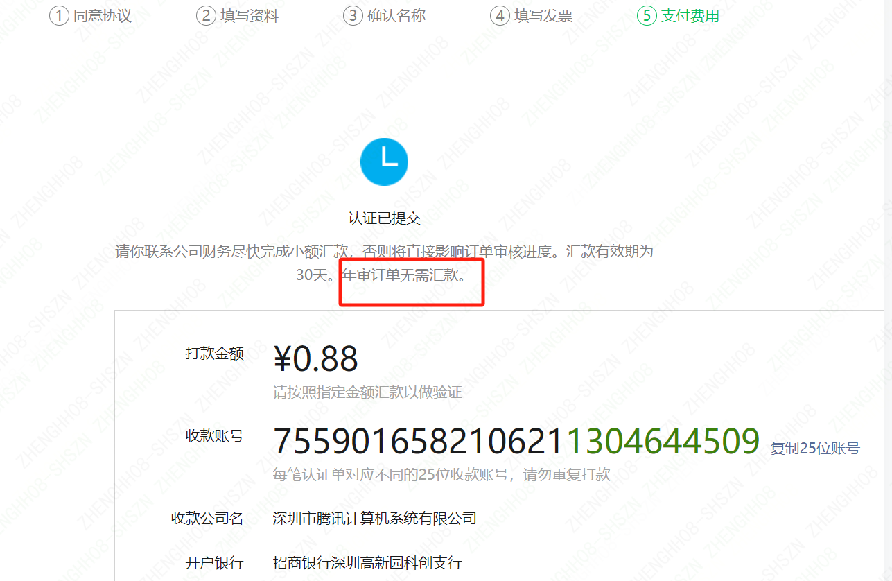 支付审核费用,目前仅支持微信支付,企业主体需缴纳300元认证费,个人主体目前需缴纳30元认证费;审核时长大概在支付完费用后的1到3天内完成