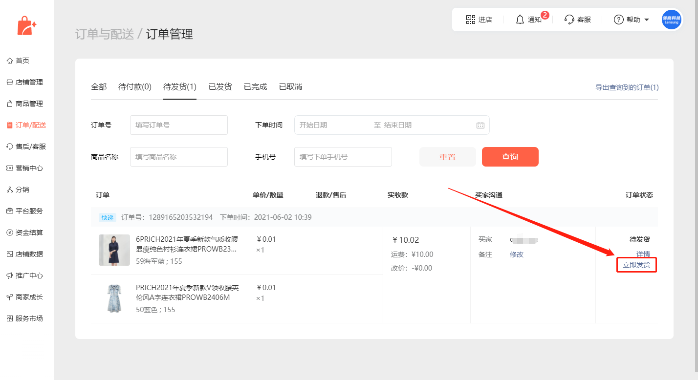 首先,商家需要登录小商店电脑端后台,在【订单/配送】>【订单管理】中找到用户订单,点击【立即发货】;