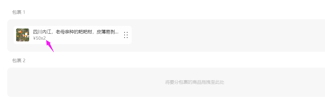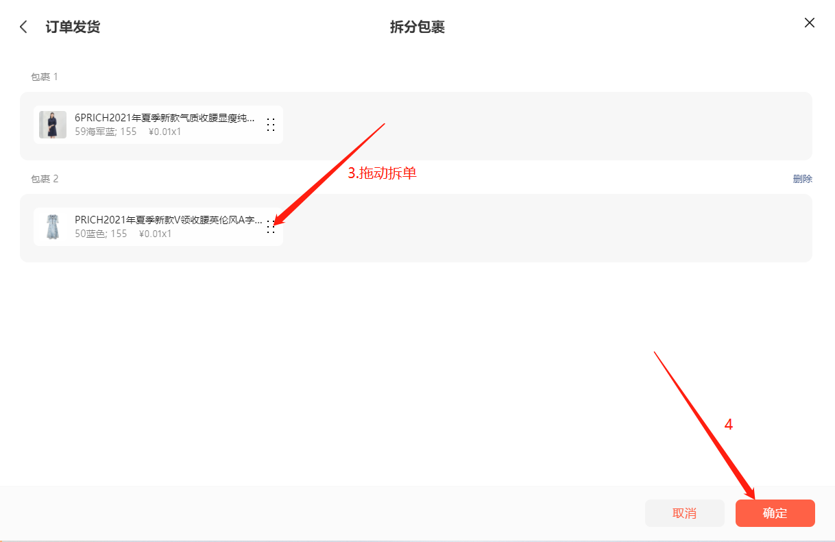 商家可以拖动对应商品,可以将订单中的商品拆分成多个包裹,点击【确定】即可完成拆单,然后就可以选择不同包裹进行发货;