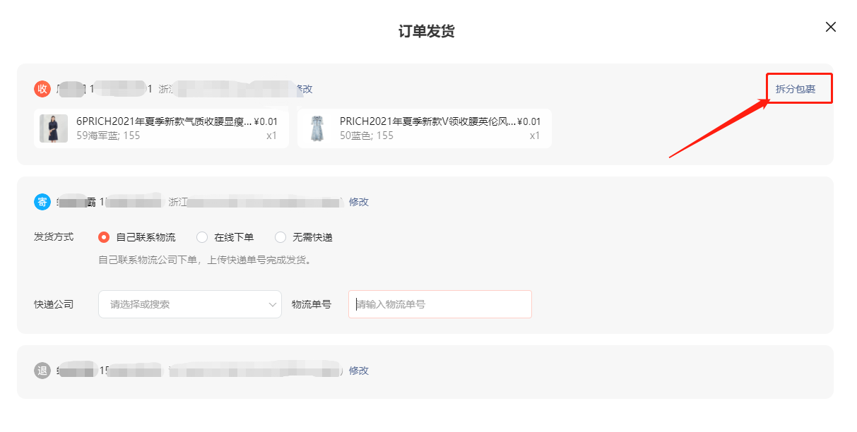在订单发货界面,点击右上角的【拆分包裹】;