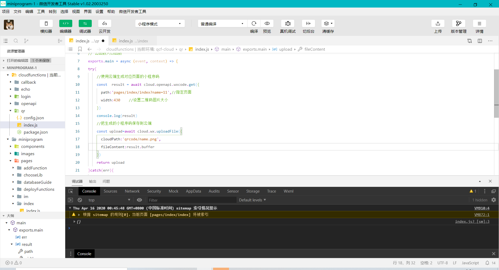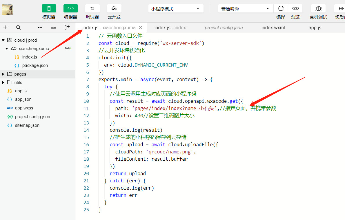这样你只需要改造下我index.js里的path和name就可以生成你想要的小程序二维码了。