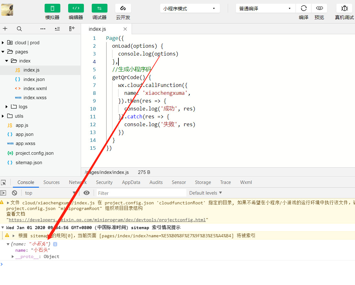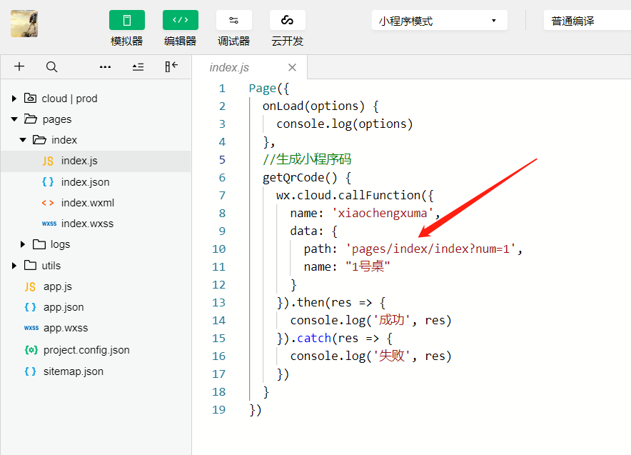 代码很简单,在第11行,我们给path参数设置了小程序页面和参数name。这样我们用微信扫码后,就会打开对应的页面,并且可以拿到name参数,