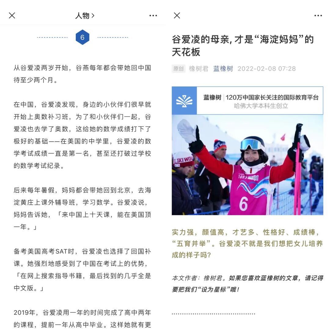 例如“人物”公众号发布的《谷爱凌,欢迎归来》一文,详细地介绍了谷爱凌从出生到成名前的家庭背景、教育、学习、生活、训练等各方面的内容。