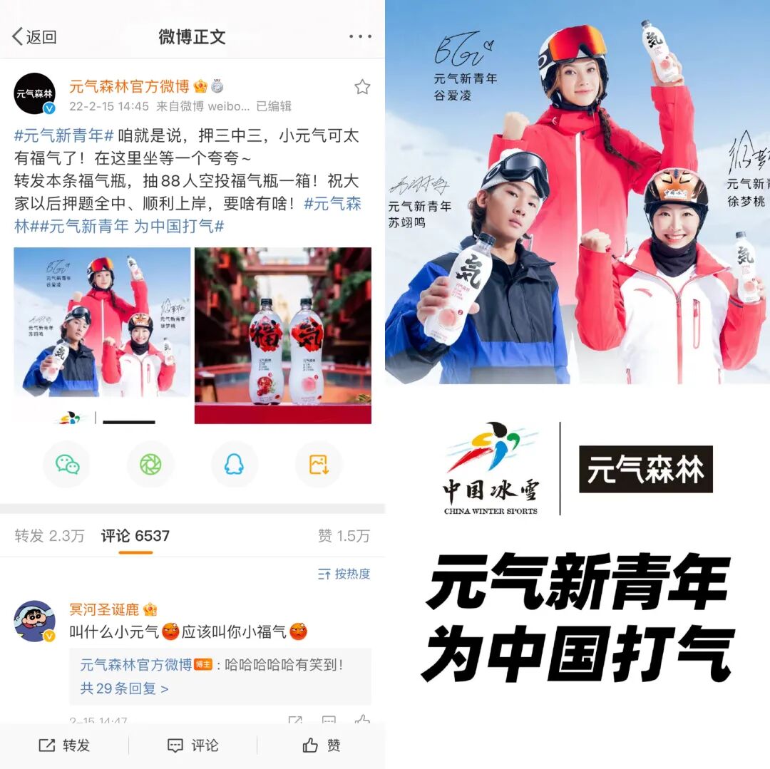 说到押宝,这里不得不提下元气森林。提前签下谷爱凌、苏翊鸣、徐梦桃,押三中三。在官方微博发布后,#元气森林赢麻了#话题迅速登上微博热搜。