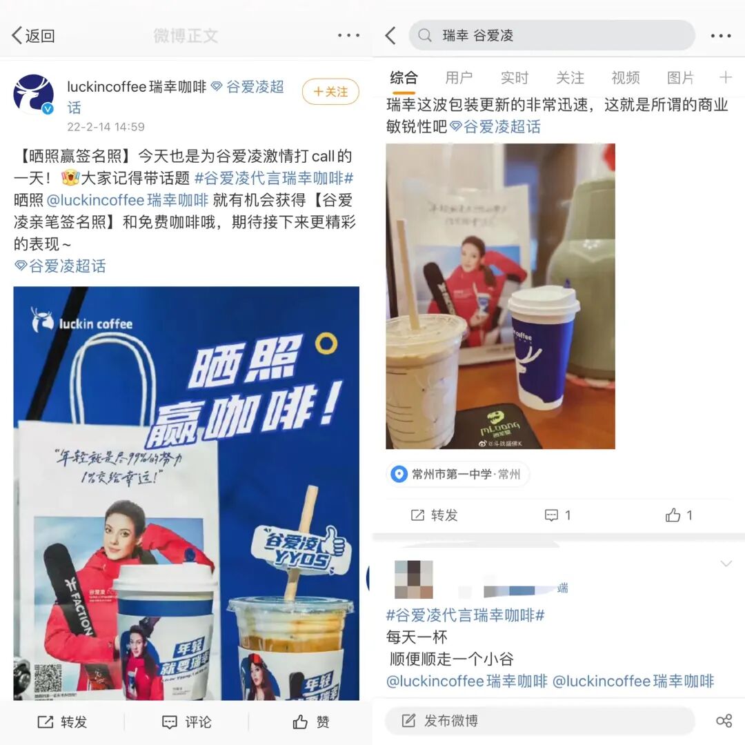 瑞幸是表现较好的,伴随着谷爱凌的热度,#瑞幸#品牌名称话题也登上热搜。而后又配合拍照打卡活动,引发众多用户参与,让热度继续发酵升温,为品牌获得更多曝光。当然也引发用户“跟风”购买,商品还时常售罄。