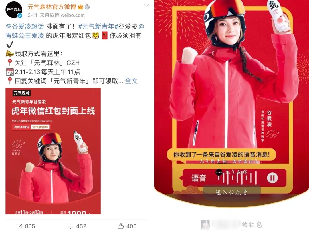 除此以外,元气森林还通过微博发布谷爱凌微信红包封面获取方法。在公众号中回复关键词获取,用户使用红包封面后跳转公众号,又给公众号引流不少。
