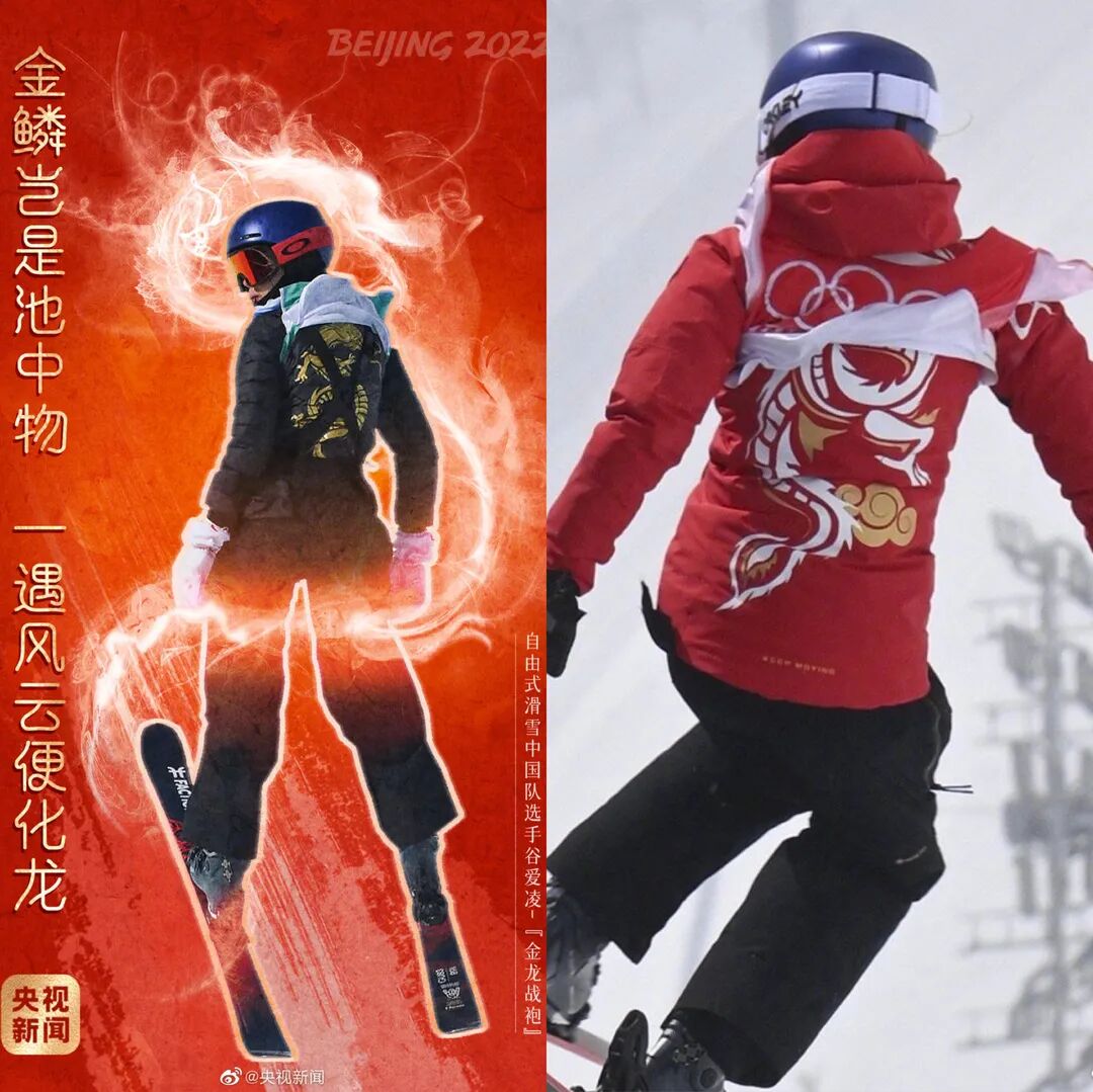 谷爱凌喜欢中国龙,便在比赛中身穿安踏定制的“龙纹战袍”。夺冠后,那身黑色金龙比赛服更是刷屏,英姿飒爽的背影酷毙了!