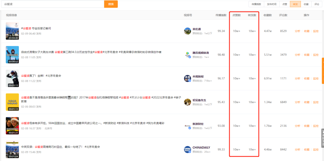 视频号上,谷爱凌相关视频的热度也是很高,不少点赞转发均10W+。