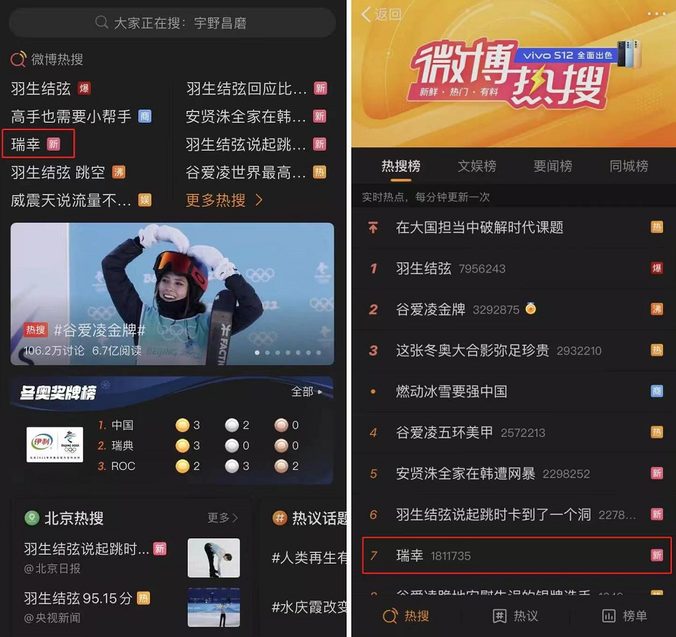 据西瓜微数显示,2月1日至2月21日,谷爱凌相关的微博热搜高达240多个,2月8日获得个人冬奥会首金当天,其微博热搜高达54个。