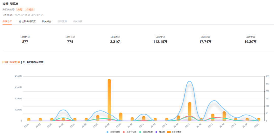 2月1日至2月21日,与谷爱凌相关的微博超20万条,总点赞6400多万,预估总阅读高达240多亿。