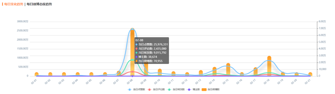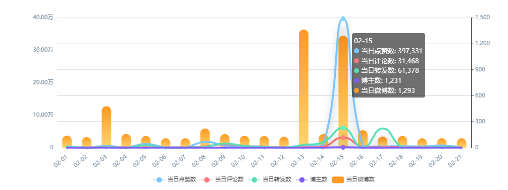 从元气森林【品牌舆情分析】每日趋势变化趋势可以看到,在2月15日当天,其互动数暴涨,尤其是点赞数。