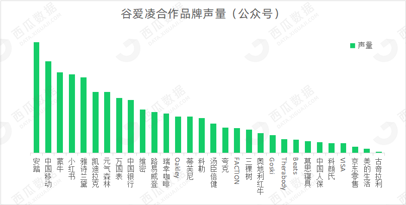 据统计,部分合作品牌在公众号中的声量,排名前三的分别是安踏、中国移动、蒙牛。