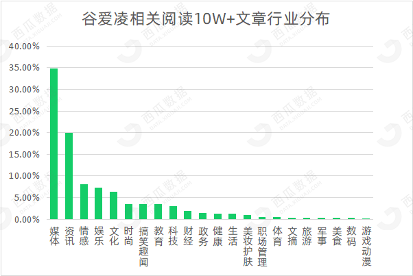 从阅读10W+文章行业分布来看,媒体、资讯行业占比过半,但情感、娱乐、文化、教育等行业对谷爱凌的讨论也较多。