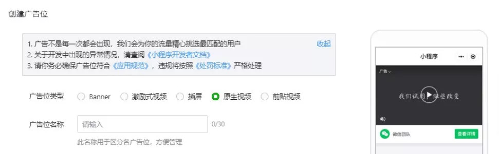 由于「视频广告组件」在内容体验上与视频信息流的体验十分接近,称之为“原生视频”也毫不为过。可以看到,在创建广告位时选择广告位类型时,「视频广告组件」的分类名称就叫“原生视频”。确实,相较banner广告,视频广告带给用户体验的突兀和割裂感,无疑会更低,因而也能带来更有效的曝光。
