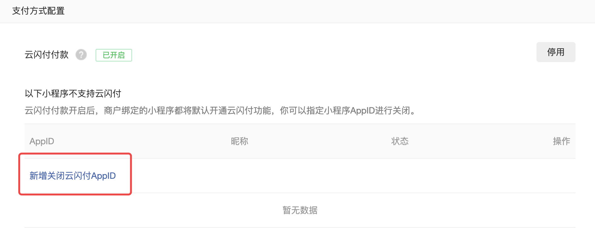 A7:可以,商户可以在商户平台指定小程序关闭该功能,并查看已关闭的小程序列表。超级管理员扫码登录商户平台「点我访问」,点击「产品中心」->「开发配置」->「支付方式配置」->「新增关闭云闪付APPID」,添加成功后该小程序用户将不再支持云闪付付款