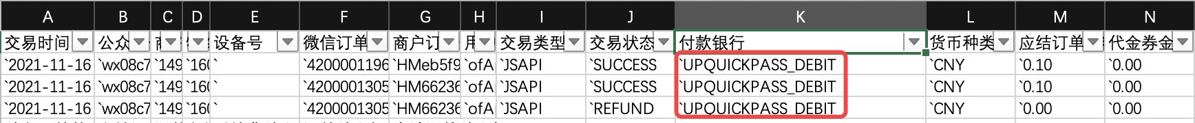扫码登录商户平台-交易中心-交易账单-下载交易账单,「付款银行字段」取值为:UPQUICKPASS_CREDIT和UPQUICKPASS_DEBIT的,即为用户使用云闪付付款的交易