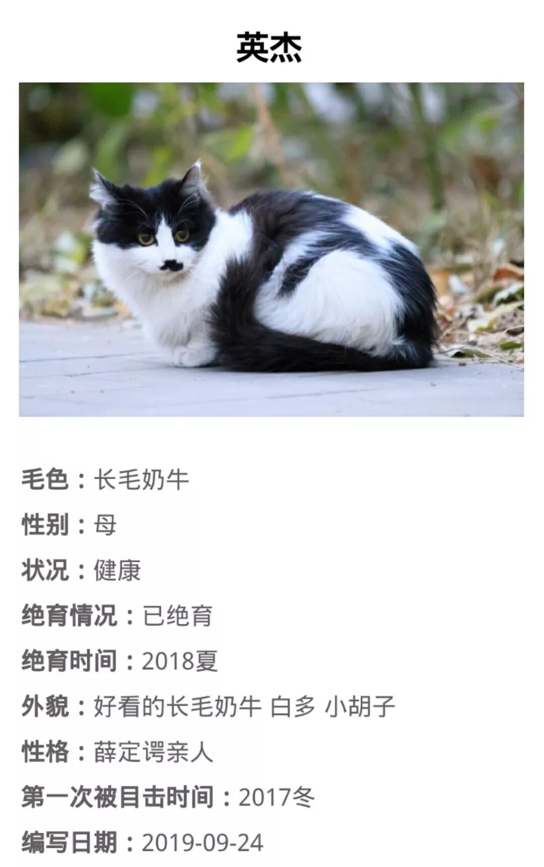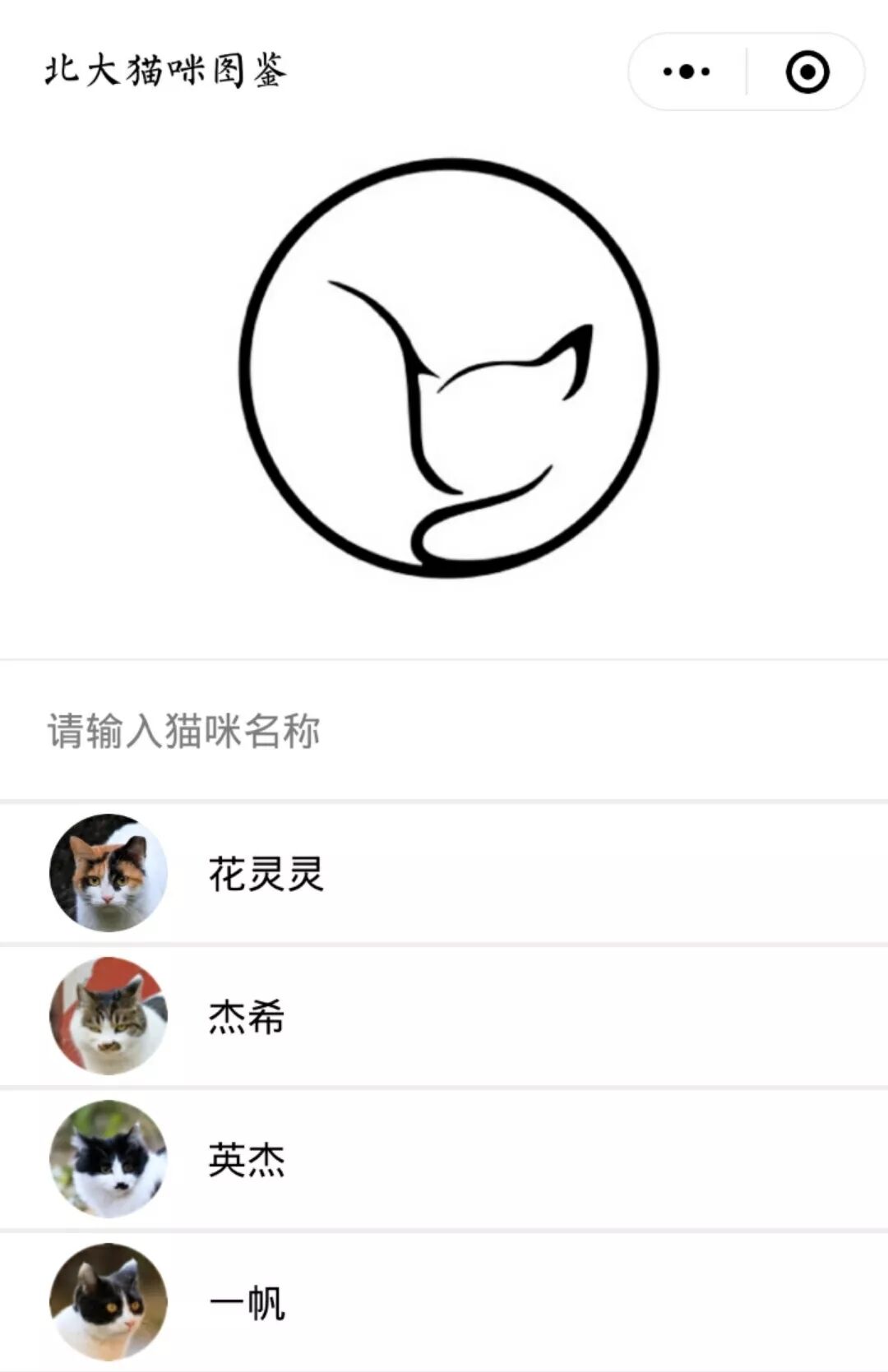 2019 年 9 月,北京大学学生流浪猫关爱协会日常部部长 circle 自主开发出“燕园猫速查手册“小程序。小程序以猫咪证件照及其档案为主要内容,涵盖名称、外貌、绝育、送养及亲人情况等信息,力图简要展现校内猫咪形象,增进爱猫群众对校内猫咪的认识,从而建立起更好的人猫互动关系。为了让其它的小动物保护组织也能使用这个小程序,circle 在此公开所有源代码。如有疑问可以联系 circle circlelq@pku.edu.cn ,circle 最近比较忙,没能及时回复邮件请见谅。