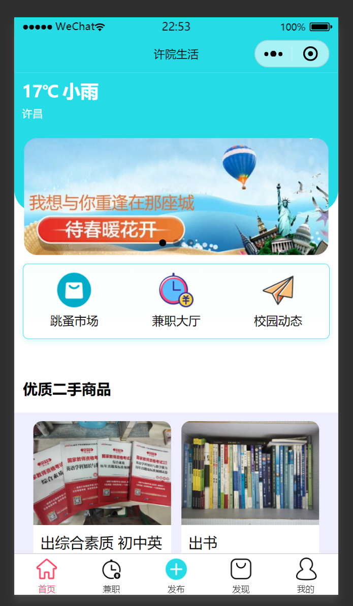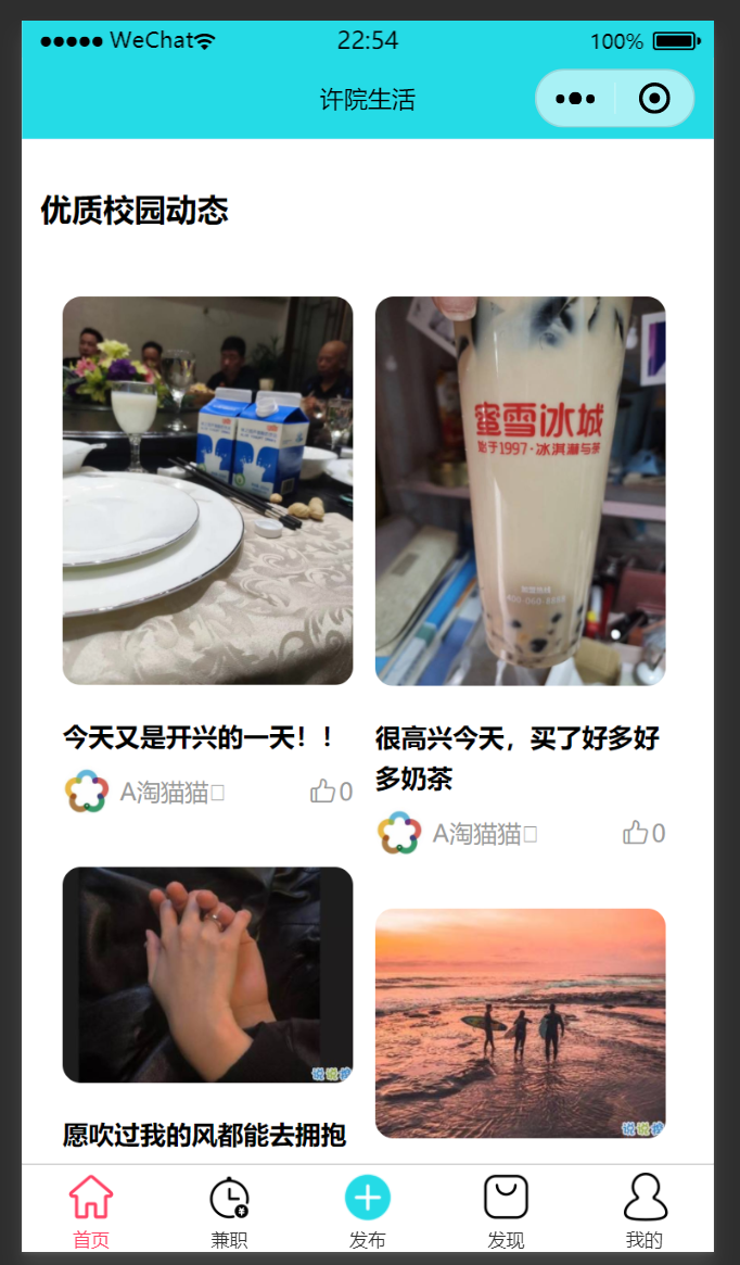 项目介绍:xcu许院生活是针对许昌学院校区学生开发的一款生活交流类小程序,项目利用云开发实现了二手商品交易、兼职发布接取、校园动态展示等功能。旨在为同学提供更加便利、安全的二手交易方式,实现同校区线上线下交易结合;为同学们集中提供更加安全,精准的兼职信息;为同校学生提供动态交流平台。