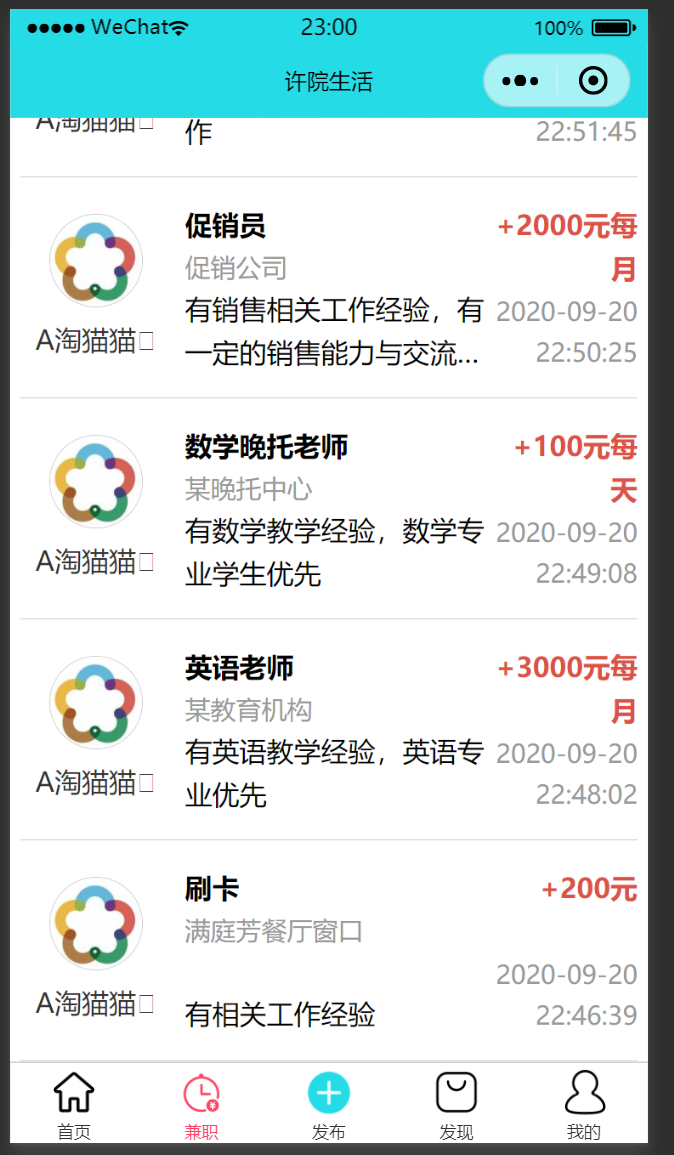 项目功能:二手商品发布、购买;考研、复习资料发布共享;同校同城兼职信息资源共享,发布与接取兼职;发布校园动态等。