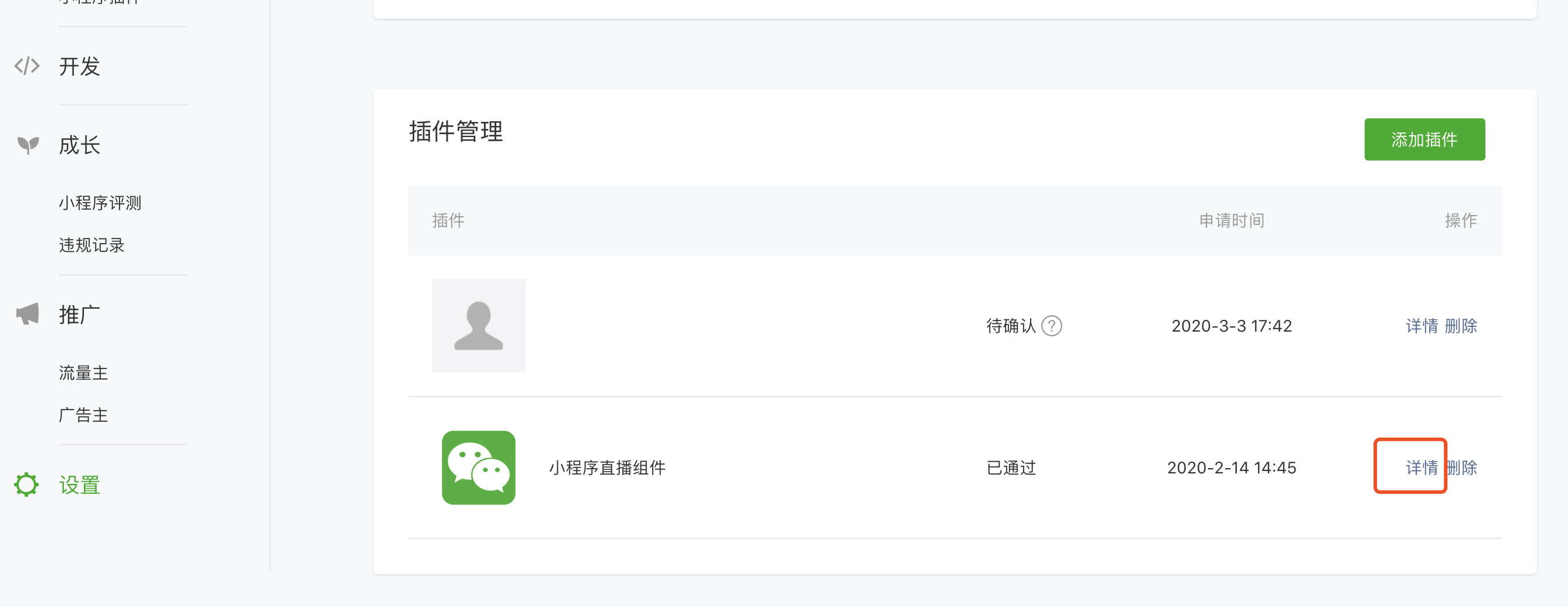 第三步点击设置后滑动到插件管理选择【小程序直播组件】点击查看详情