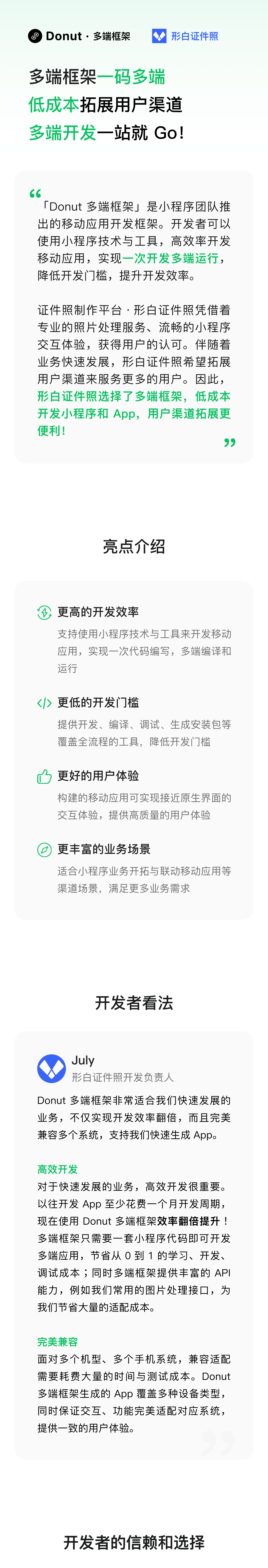 伴随着业务快速发展,证件照制作平台 · 形白证件照希望拓展用户渠道来服务更多的用户。因此,形白证件照选择了多端框架,低成本开发小程序和 App,用户渠道拓展更便利!