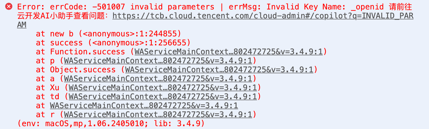 此时因为 doc 中包含了 _openid 和 _id 字段,所以会抛出上图所示异常。