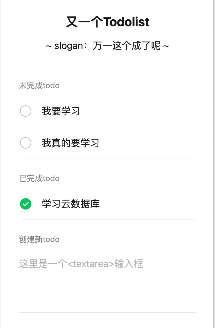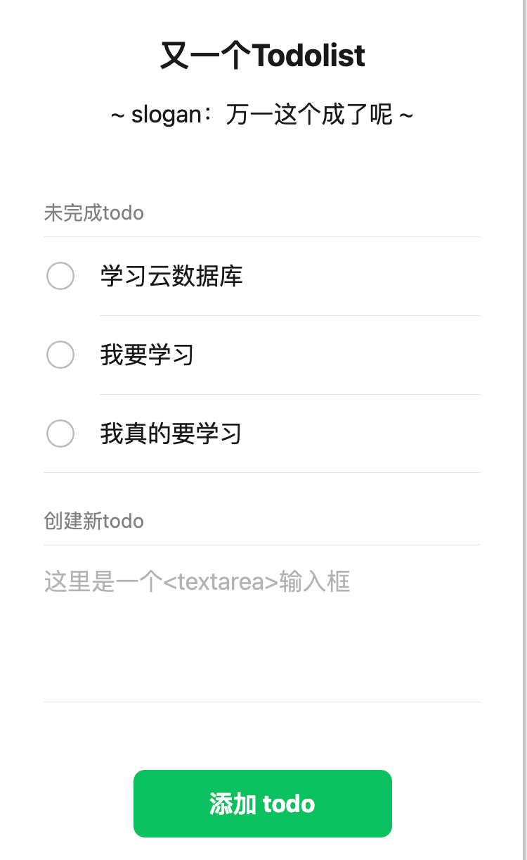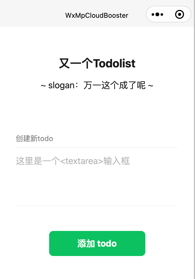 获取 WxMpCloudBooster 项目代码并切换到 article2 分支后,请你复制 miniprogram/pages/todo/todo.wxml 文件到你的项目中。刷新页面获得如图所示效果: