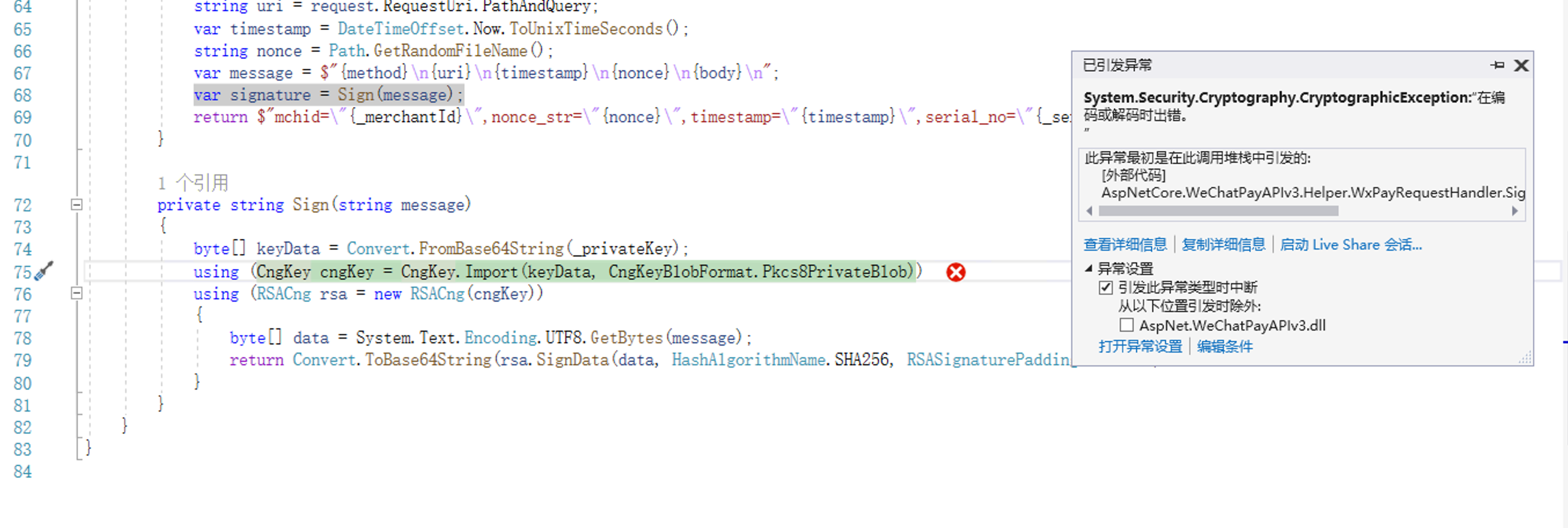 protected string Sign(string message) { // NOTE: 私钥不包括私钥文件起始的-----BEGIN PRIVATE KEY----- // 亦不包括结尾的-----END PRIVATE KEY----- string privateKey = "{你的私钥}"; var rsa = RSA.Create(); rsa.ImportPkcs8PrivateKey(Convert.FromBase64String(privateKey), out _); var signbytes = rsa.SignData(Encoding.UTF8.GetBytes(message), HashAlgorithmName.SHA256, RSASignaturePadding.Pkcs1); return Convert.ToBase64String(signbytes); }