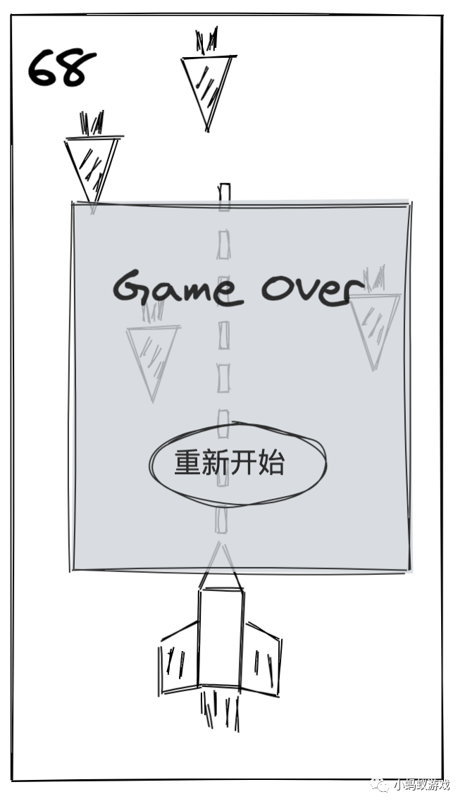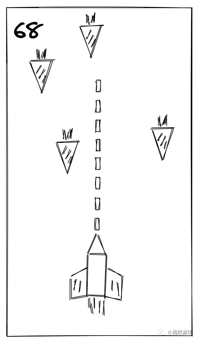 现在,游戏有了目标和结束条件,我们想法更加清晰和明确了:这是一个太空射击游戏,敌机不停的从上方入侵,玩家需要使用手指拖拽的方式控制战机移动,击毁或者躲避飞来的敌机,要在不被敌机碰到的前提下,击毁尽可能多的敌机,以获得更高的分数。