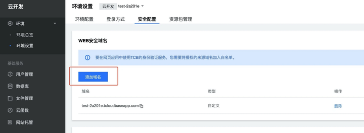 此时,你需要添加安全域名,将你应用所在域名添加到云开发实例的安全域名列表内(Web应用需要将域名添加到【环境】-【安全配置】-【WEB安全域名】列表中,否则将被识别为非法来源。)