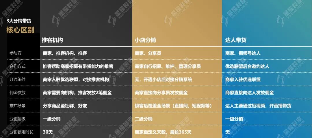 这3种方式有什么区别?我们总结出7大核心区别,分别是参与方、合作方式、开通条件、佣金发放、推广场景、分销层级、分销锁定时长,便于商家全方位了解。