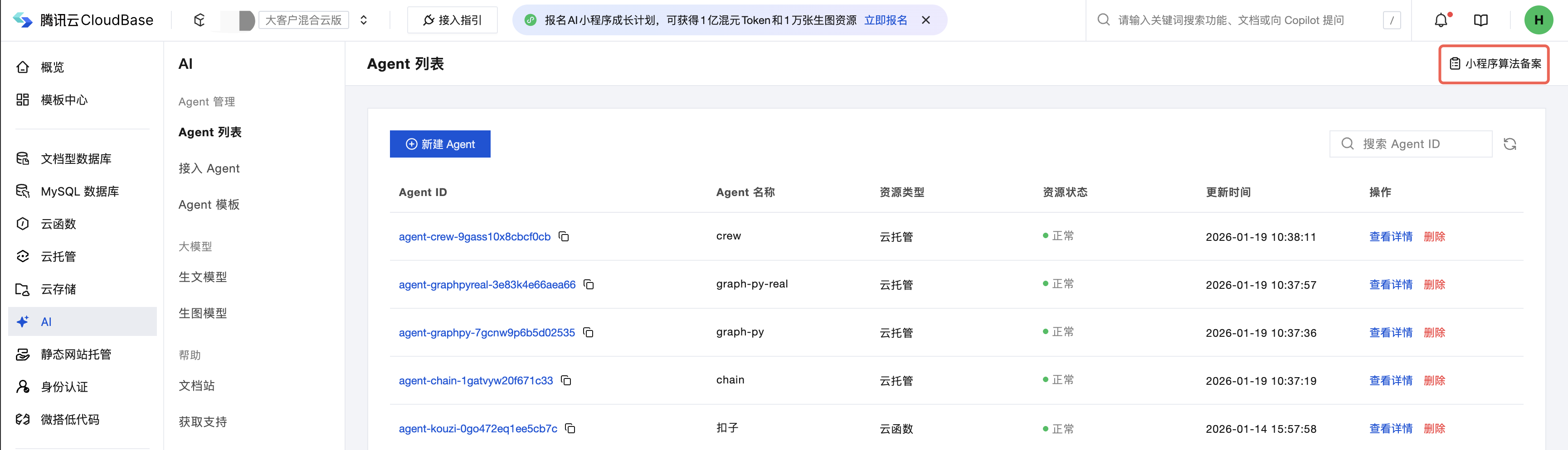 - 进入云开发平台 AI ,点击小程序算法备案