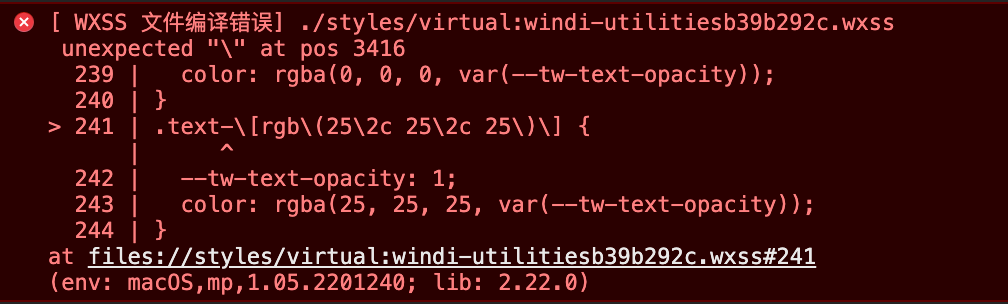 首先我们可以根据 Tailwind/Windi CSS 的 classes 系列找到所有可能在 CSS 中生成的不被小程序支持的字符。如我们在使用 h-[0.5px] 时生成的选择器为 .h-\[0\.5px\],使用 !translate-x-1/2 生成的选择器则为 .\!translate-x-1\/2 ,根据这些规律我们找到了所有的特殊字符串 \[ \] \( \) \# \! \/ \. \: \,。如果是在浏览器环境中,通过反斜线 \ 转义的字符是可以作为选择器正常使用的,但一旦这些字符串出现在小程序中作为选择器名称,程序会直接 crash。