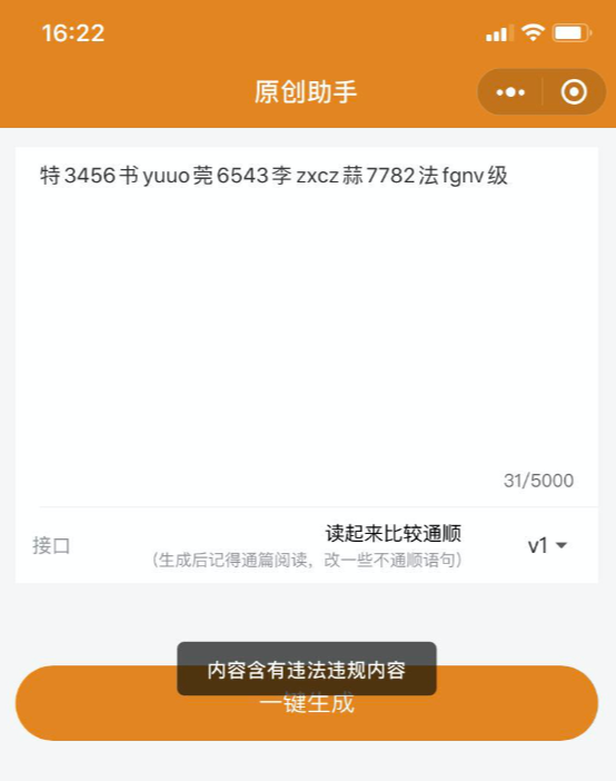 原创助手:可以洗文章,做伪原创,因为我平时会发很多原创文章,百度搜一堆都是花钱的。小程序搜一堆要么是不能用的,要么就是让你免费用几次,然后变相和你收费。于是萌生了一个想法,自己写一个文本转换接口。因为本小程序核心功能在于转化文字生成伪原创,说实话一来比较缺德,二来担心微信审核不通过,于是咨询了一下社区突出贡献者(此处@Stephen),除了缺德之外没什么违规内容。这里声明一下:这个程序是我自己用的,有时候我会洗一段话~自己再改改,如果你们用,请尊重原创,不要用于非法用途。