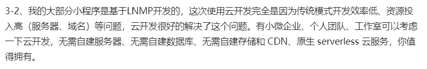 3-2、我的大部分小程序是基于LNMP开发的,这次使用云开发完全是因为传统模式开发效率低、资源投入高(服务器、域名)等问题,云开发很好的解决了这个问题。有小微企业、个人团队、工作室可以考虑一下云开发,无需自建服务器、无需自建数据库、无需自建存储和 CDN、原生 serverless 云服务,你值得拥有。
