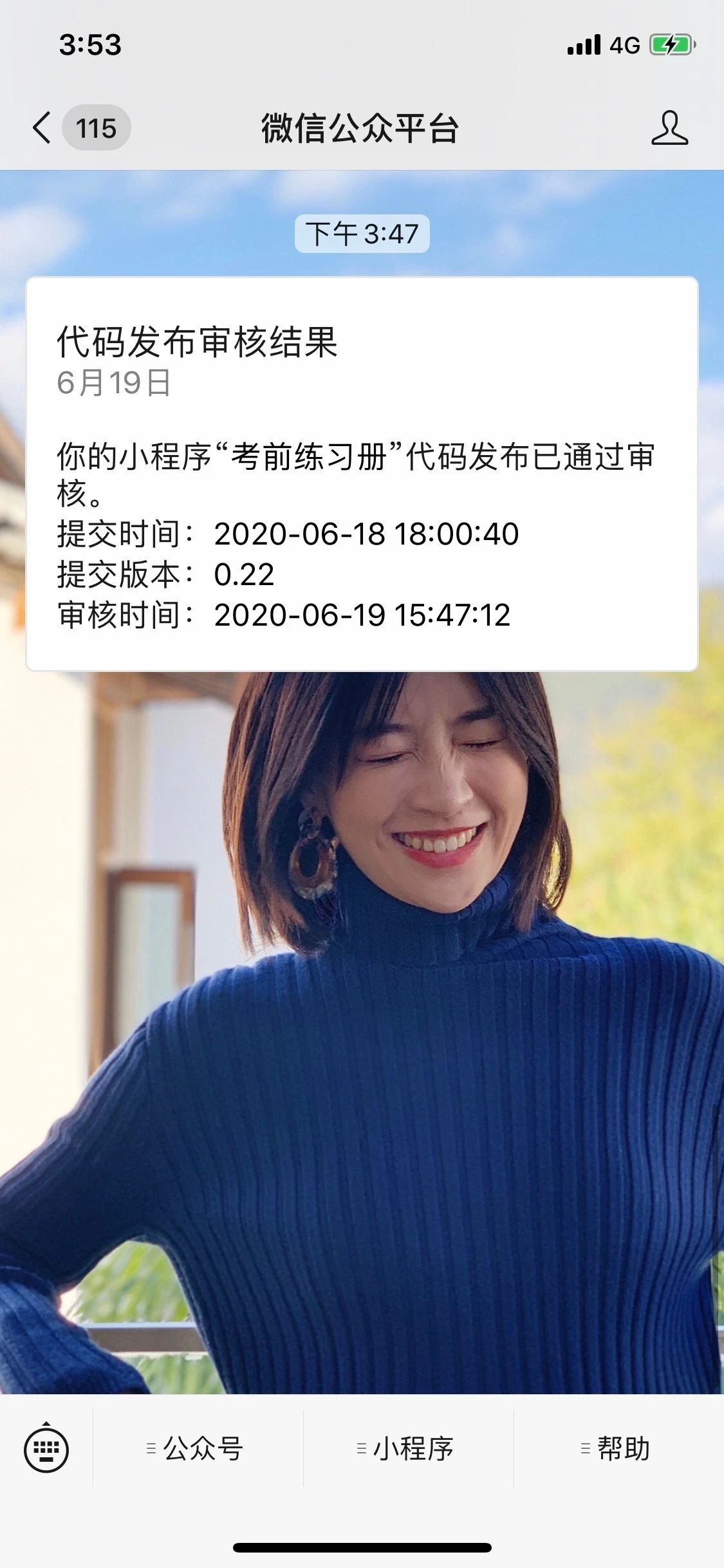 你的小程序"考前练习册",提审时间2020-06-18 15:40:49,版本审核未通过。