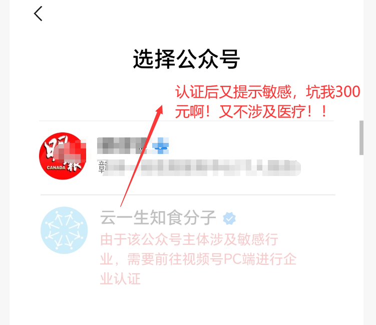用公众号辅助认证视频号,提示涉及敏感行业,可明明不涉及医疗之类的啊,坑我300元?