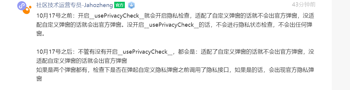 官方的能力有问题,开发者通过自定义弹窗获取到用户《隐私指引》的同意后,在发起隐私信息调用时,依然会弹出微信官方弹窗,根本没办法通过自定义弹窗控制疲劳度,有人遇到一样的问题吗??
