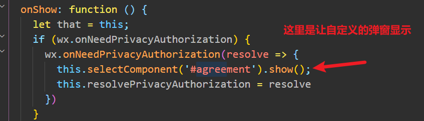 2、最后需要在onLoad或者onShow里加上以下监听代码,在这里边让自定义的隐私弹窗显示出来即可。