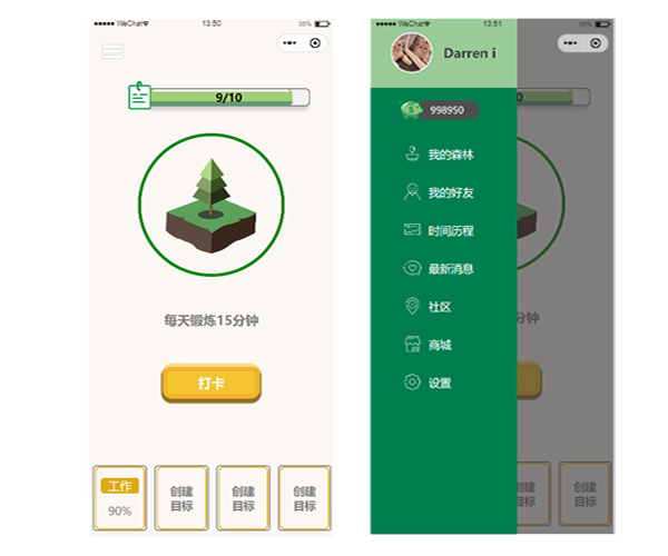 主界面功能:心里有树基于集成打卡功能以及创建目标的主界面,并将代码容易服用的开发成为组件,符合小程序的开发规范。用户所创建的目标都表现在主页并通过主页下方的滑动组件以查看所有的目标。