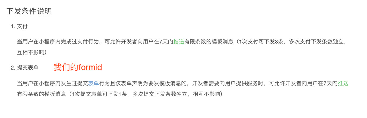 看官方文档,可以知道我们的formid有效期是7天,并且一个form_id只能使用一次,所以我们小程序端所需要做的就是尽可能的多拿些formid,然后传个后台,让后台存到数据库中,这样7天有效期内,想怎么用就怎么用了。