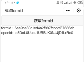 我们要做的就是点击获取formid按钮,可以获取到用户的formid和openid,正常我们开发时,是需要把openid和formid传给后台的,这里简单起见,我们直接用获取到的formid和openid实现推送功能