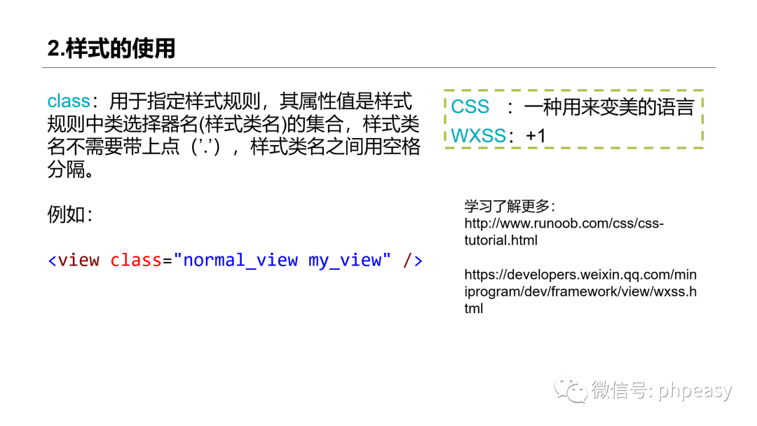 - class属性的属性值为wxss文件中的声明块的名称,也即类选择器;