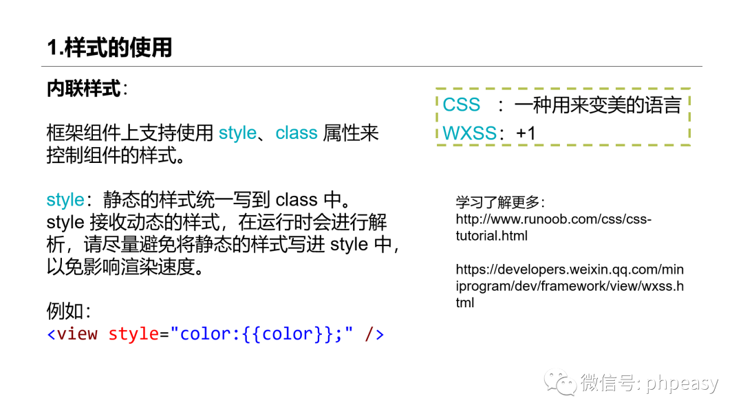 也就是说,class的方式才需要我们将样式写进wxss中,而如果使用style方式,则需要我们将声明直接写到wxml文件中的style属性值中。这里的声明同样可以写很多条,但是不要忘记使用分号进行分隔。通过style直接将样式写在wxml中的方式称为内联样式。