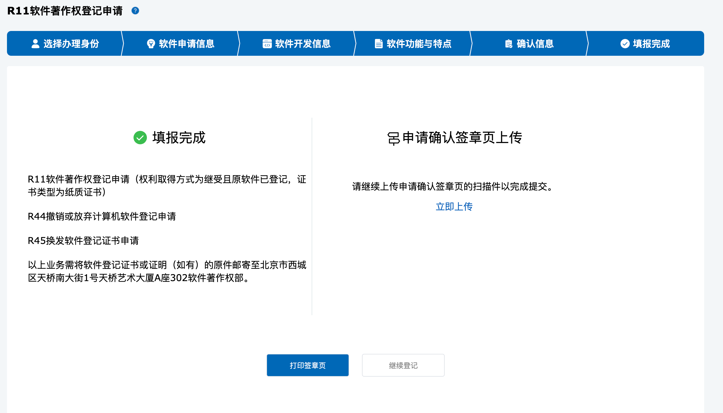 此步骤需要打印签章页,手写签名,扫描后再上传。上传完成后即完成了的申请流程,接下来等待受理和审查。