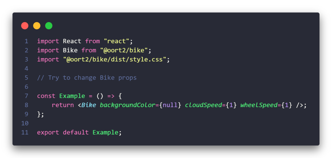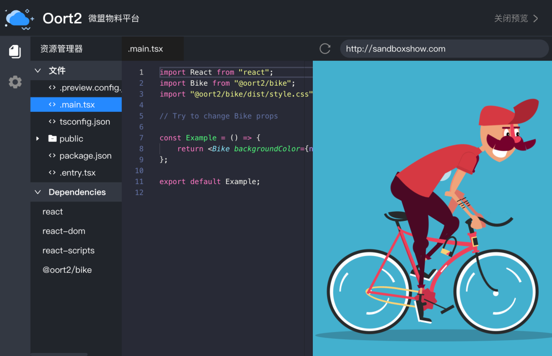 需要接入物料平台并预览,首先在项目根目录添加 example 文件夹,编写入口文件,这里有一个小细节需要注意,我们这里的 import Bike from '@oort2/bike',这里 @oort2/bike 是当前包名,这是被预览的包给外部使用时的导入方式,预览也是使用了这种形式(我们必须且只能这么做),实际开发调试时使用了 vite/webpack alias 重定向到了 src/index 中。