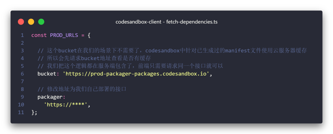 CodeSandBox 中,除了会向打包服务请求获取依赖的内容之外,还有回退方案。就是在找不到依赖的时候,会直接请求某个依赖的 unpk 地址,这里需要添加内部的unpkg 地址逻辑并指向公司的 unpkg 服务上。