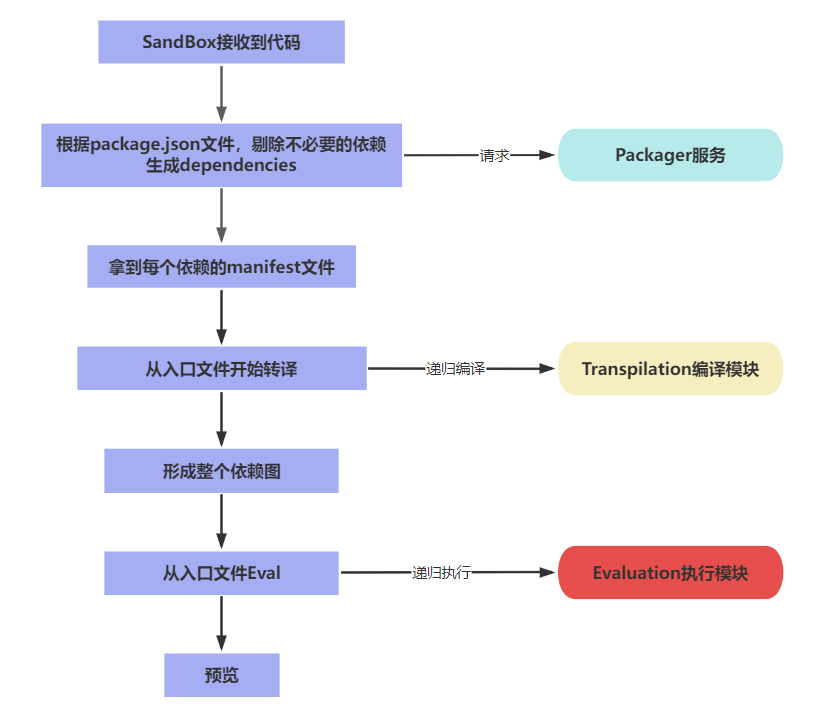 本质上 CodeSandBox 实现了一个浏览器端的 webpack ,通过其实现的 Packager 安装所需要的依赖,在 SandBox 中通过这个 webpack 将文件编译,再将编译后的文件通过 eval 在浏览器中运行。